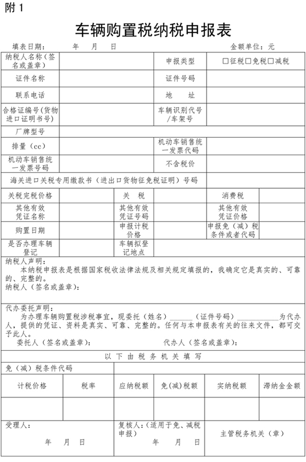 《車輛購置稅納稅申報表》填表說明 1.本表由車輛購置稅納稅人在辦理納(免、減)稅申報時填寫(打印),由納稅人簽章確認。 2.“納稅人名稱”欄,填寫辦理申報時提供的納稅人證件上注明的名稱。 3.“證件名稱”欄,單位納稅人填寫《統(tǒng)一社會信用代碼證書》或者《營業(yè)執(zhí)照》或者其他有效機構(gòu)證明;個人納稅人填寫《居民身份證》或者其他身份證明名稱。 4.“證件號碼”欄,填寫“證件名稱”欄填寫的證件的號碼。 5.“合格證編號(貨物進口證明書號)”“車輛識別代號/車架號”“廠牌型號”“排量(cc)”欄,分別按照車輛合格證或者《中華人民共和國海關(guān)貨物進口證明書》或者《中華人民共和國海關(guān)監(jiān)管車輛進(出)境領(lǐng)(銷)牌照通知書》或者《沒收走私汽車、摩托車證明書》中對應的編號、車輛識別代號/車架號、車輛品牌和車輛型號、排量填寫。 6.“機動車銷售統(tǒng)一發(fā)票代碼”“機動車銷售統(tǒng)一發(fā)票號碼”“不含稅價”欄,分別按照機動車銷售統(tǒng)一發(fā)票相應項目填寫。 7.下列欄次由進口自用車輛的納稅人填寫: (1)“海關(guān)進口關(guān)稅專用繳款書(進出口貨物征免稅證明)號碼”欄,填寫《海關(guān)進口關(guān)稅專用繳款書》中注明的號碼;免征關(guān)稅應稅車輛填寫《進出口貨物征免稅證明》中注明的編號。 (2)“關(guān)稅完稅價格”欄,通過《海關(guān)進口關(guān)稅專用繳款書》《海關(guān)進口消費稅專用繳款書》《海關(guān)進口增值稅專用繳款書》或者其他資料進行采集,順序如下: 、佟逗jP(guān)進口關(guān)稅專用繳款書》中注明的關(guān)稅完稅價格; 、 在免關(guān)稅的情況下,通過《海關(guān)進口消費稅專用繳款書》中注明的完稅價格和消費稅稅額計算關(guān)稅完稅價格; 、 在免關(guān)稅和免或者不征消費稅的情況下,采用《海關(guān)進口增值稅專用繳款書》中注明的完稅價格; 、 在關(guān)稅、消費稅和增值稅均免征或者不征的情況下,通過其他資料采集關(guān)稅完稅價格。 (3)“關(guān)稅”欄,填寫《海關(guān)進口關(guān)稅專用繳款書》中注明的關(guān)稅稅額。 。4)“消費稅”欄,填寫《海關(guān)進口消費稅專用繳款書》中注明的消費稅稅額。 8.“其它有效憑證名稱”“其它有效憑證號碼”“其它有效憑證價格”欄由未取得機動車銷售統(tǒng)一發(fā)票且非進口自用的納稅人按取得的相應證明資料內(nèi)容填寫。 9.“購置日期”欄,填寫機動車銷售統(tǒng)一發(fā)票或者海關(guān)進口關(guān)稅專用繳款書(進出口貨物征免稅證明)或者其他有效憑證的開具或者生效日期。 10.“申報計稅價格”欄,分別按照下列要求填寫: 。1)境內(nèi)購置車輛,按照車輛相關(guān)憑證的不含稅價填寫; (2)進口自用車輛,按計稅價格填寫,計稅價格=關(guān)稅完稅價格+關(guān)稅+消費稅; 11.“申報免(減)稅條件或者代碼”欄,分別按照下列情形填寫文字或者代碼: A.外國駐華使館、領(lǐng)事館和國際組織駐華機構(gòu)及其有關(guān)人員自用的車輛,免稅; B.中國人民解放軍和中國人民武裝警察部隊列入裝備訂貨計劃的車輛,免稅; C.懸掛應急救援專用號牌的國家綜合性消防救援車輛,免稅; D.設有固定裝置的非運輸專用作業(yè)車輛,免稅; E.城市公交企業(yè)購置的公共汽電車輛,免稅; F.國務院規(guī)定予以免稅或者減稅的其他情形的,按照規(guī)定免稅或者減稅。 12.“是否辦理車輛登記”欄,如填寫“是”,則“車輛擬登記地點”欄應填寫具體縣(市、區(qū))。 13.本表一式二份(一車一表),一份由納稅人留存,一份由主管稅務機關(guān)留存。
