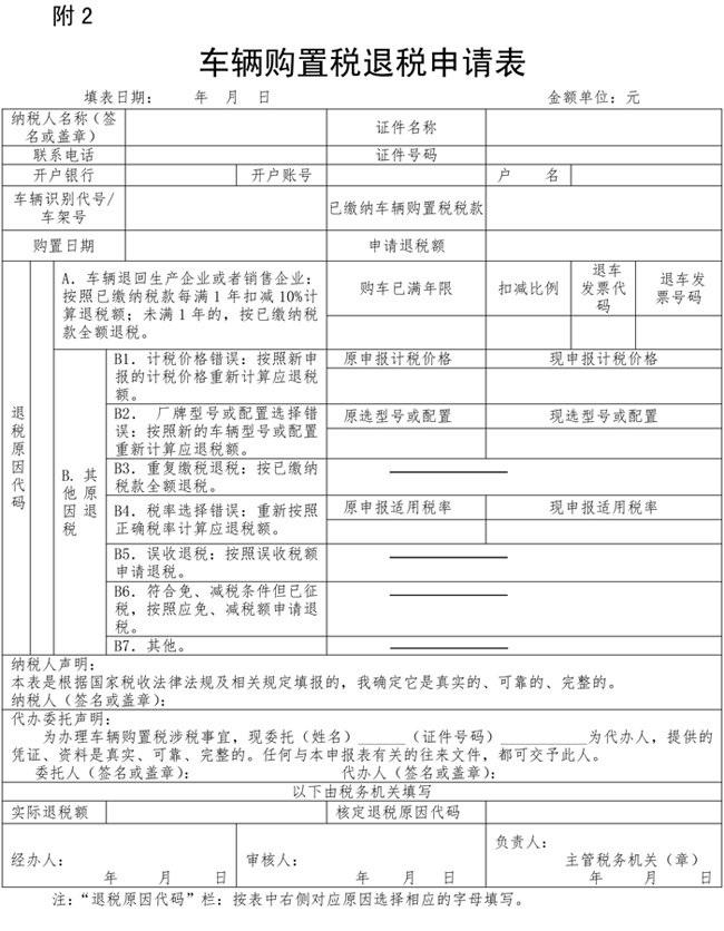 《車輛購置稅退稅申請表》填表說明 1.本表由車輛購置稅納稅人在辦理退稅申請時填寫(打印),由納稅人簽章確認。 2.“納稅人名稱”欄,填寫辦理退稅申報時提供的納稅人證件上注明的名稱。 3.“證件名稱”欄,單位納稅人填寫《統(tǒng)一社會信用代碼證書》或者《營業(yè)執(zhí)照》或者其他有效機構(gòu)證明;個人納稅人填寫《居民身份證》或者其他身份證明名稱。 4.“證件號碼”欄,填寫“證件名稱”欄填寫的證件的號碼。 5.“開戶銀行”“賬號”“戶名”欄,填寫納稅人用來接收國庫退稅稅款的開戶銀行、賬號及開戶名稱。 6.“車輛識別代號/車架號”欄,按車輛合格證或者《中華人民共和國海關(guān)貨物進口證明書》或者《中華人民共和國海關(guān)監(jiān)管車輛進(出)境領(lǐng)(銷)牌照通知書》或者《沒收走私汽車、摩托車證明書》中對應的車輛識別代號(車架號)填寫。 7.“已繳納車輛購置稅稅款”欄,填寫主管稅務機關(guān)開具的車輛購置稅繳稅憑證上注明的繳稅金額。 8.“購置日期”欄,填寫機動車銷售統(tǒng)一發(fā)票(或者有效憑證)上注明的開票日期。 9.“申請退稅額”欄,填寫納稅人向稅務機關(guān)申請的退稅金額。 10.“退稅原因代碼”欄,按表中右側(cè)對應原因選擇相應的字母填寫。 11.本表(一車一表)一式三份,一份由納稅人留存;一份由國庫留存;一份由主管稅務機關(guān)留存。