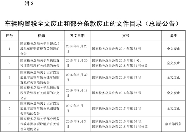 為落實《中華人民共和國車輛購置稅法》(以下簡稱《車購稅法》),規(guī)范車輛購置稅征收管理,現(xiàn)就有關(guān)事項公告如下: 一、車輛購置稅實行一車一申報制度。 二、《車購稅法》第六條第四項所稱的購置應稅車輛時相關(guān)憑證,是指原車輛所有人購置或者以其他方式取得應稅車輛時載明價格的憑證。無法提供相關(guān)憑證的,參照同類應稅車輛市場平均交易價格確定其計稅價格。無同類應稅車輛市場平均交易價格的,由稅務機關(guān)依據(jù)《中華人民共和國稅收征收管理法》(以下簡稱《稅收征管法》)及其實施細則核定其應納稅額。 原車輛所有人為車輛生產(chǎn)或者銷售企業(yè),未開具機動車銷售統(tǒng)一發(fā)票的,按照車輛生產(chǎn)或者銷售同類應稅車輛的銷售價格確定應稅車輛的計稅價格。無同類應稅車輛銷售價格以及同類應稅車輛無銷售價格的,按照組成計稅價格確定應稅車輛的計稅價格。 三、購置應稅車輛的納稅人,應當?shù)较铝械攸c申報納稅: 。ㄒ唬┬枰k理車輛登記的,向車輛登記地的主管稅務機關(guān)申報納稅; 。ǘ┎恍枰k理車輛登記的,單位納稅人向其機構(gòu)所在地主管稅務機關(guān)申報納稅,個人納稅人向其戶籍所在地或者經(jīng)常居住地的主管稅務機關(guān)申報納稅。 四、《車購稅法》第十二條所稱納稅義務發(fā)生時間,按照下列情形確定: 。ㄒ唬┵徺I自用應稅車輛的為購買之日,即車輛相關(guān)價格憑證的開具日期; (二)進口自用應稅車輛的為進口之日,即《海關(guān)進口增值稅專用繳款書》或者其他有效憑證的開具日期; 。ㄈ┳援a(chǎn)、受贈、獲獎或者以其他方式取得并自用應稅車輛的為取得之日,即合同、法律文書或者其他有效憑證的生效或者開具日期。 五、納稅人辦理納稅申報時應當如實填報《車輛購置稅納稅申報表》(附件一,以下簡稱《納稅申報表》),同時提供車輛合格證明和車輛相關(guān)價格憑證。 六、納稅人在辦理車輛購置稅免稅、減稅時,除按本公告第五條規(guī)定提供資料外,還應當根據(jù)不同的免減稅項目,分別提供以下資料的原件或者復印件: 。ㄒ唬┩鈬v華使館、領(lǐng)事館和國際組織駐華機構(gòu)及其有關(guān)人員自用車輛,提供機構(gòu)證明和外交部門出具的身份證明。 。ǘ┏鞘泄黄髽I(yè)購置的公共汽電車輛,提供所在地縣級以上(含縣級)交通運輸主管部門出具的公共汽電車輛認定表。 。ㄈ⿷覓鞈本仍畬S锰柵频膰揖C合性消防救援車輛,提供中華人民共和國應急管理部批準的相關(guān)文件。 (四)回國服務的在外留學人員購買的自用國產(chǎn)小汽車,提供海關(guān)核發(fā)的《中華人民共和國海關(guān)回國人員購買國產(chǎn)汽車準購單》。 。ㄎ澹╅L期來華定居專家進口自用小汽車,提供國家外國專家局或者其授權(quán)單位核發(fā)的專家證或者A類和B類《外國人工作許可證》。 七、免稅、減稅車輛因轉(zhuǎn)讓、改變用途等原因不再屬于免稅、減稅范圍的,納稅人在辦理納稅申報時,應當如實填報《納稅申報表》。發(fā)生二手車交易行為的,提供二手車銷售統(tǒng)一發(fā)票;屬于其他情形的,按照相關(guān)規(guī)定提供申報材料。 八、已經(jīng)繳納車輛購置稅的,納稅人向原征收機關(guān)申請退稅時,應當如實填報《車輛購置稅退稅申請表》(附件二,以下簡稱《退稅申請表》),除提供納稅人身份證明外,還應當按照下列情況分別提供以下資料: 。ㄒ唬┸囕v退回生產(chǎn)企業(yè)或者銷售企業(yè)的,提供生產(chǎn)企業(yè)或者銷售企業(yè)開具的退車證明和退車發(fā)票。 。ǘ┢渌罁(jù)法律法規(guī)規(guī)定應當退稅的,根據(jù)具體情形提供相關(guān)資料。 九、納稅人應如實申報應稅車輛的計稅價格。 納稅人沒有編造虛假計稅依據(jù)的,稅務機關(guān)按照其申報的計稅價格征收稅款;納稅人編造虛假計稅依據(jù)的,稅務機關(guān)依照《稅收征管法》及其實施細則的相關(guān)規(guī)定處理。 十、稅務機關(guān)追繳稅款時,納稅人無法按照規(guī)定提供申報資料的,可以依據(jù)司法、審計、財政等有關(guān)機關(guān)的文書,為其辦理補稅手續(xù)。 十一、本公告要求納稅人提供的資料,稅務機關(guān)能夠通過政府信息共享等手段獲取相關(guān)資料信息的,納稅人不再提交。 十二、本公告所稱的納稅人身份證明:單位納稅人為《統(tǒng)一社會信用代碼證書》或者營業(yè)執(zhí)照或者其他有效機構(gòu)證明,個人納稅人為居民身份證或者居民戶口簿或者入境的身份證件。 本公告所稱車輛合格證明為整車出廠合格證或者車輛電子信息單。 本公告所稱車輛相關(guān)價格憑證,境內(nèi)購置車輛為機動車銷售統(tǒng)一發(fā)票或者其他有效憑證,進口自用車輛為《海關(guān)進口關(guān)稅專用繳款書》或者海關(guān)進出口貨物征免稅證明。屬于應征消費稅車輛的還包括《海關(guān)進口消費稅專用繳款書》。 十三、稅務機關(guān)應當在稅款足額入庫或者辦理免稅手續(xù)后,將應稅車輛完稅或者免稅電子信息,及時傳送給公安機關(guān)交通管理部門。 上款所指稅款足額入庫的情形包括:納稅人到銀行辦理車輛購置稅稅款繳納(轉(zhuǎn)賬或者現(xiàn)金)由銀行將稅款繳入國庫的,國庫已傳回《稅收繳款書(銀行經(jīng)收專用)》聯