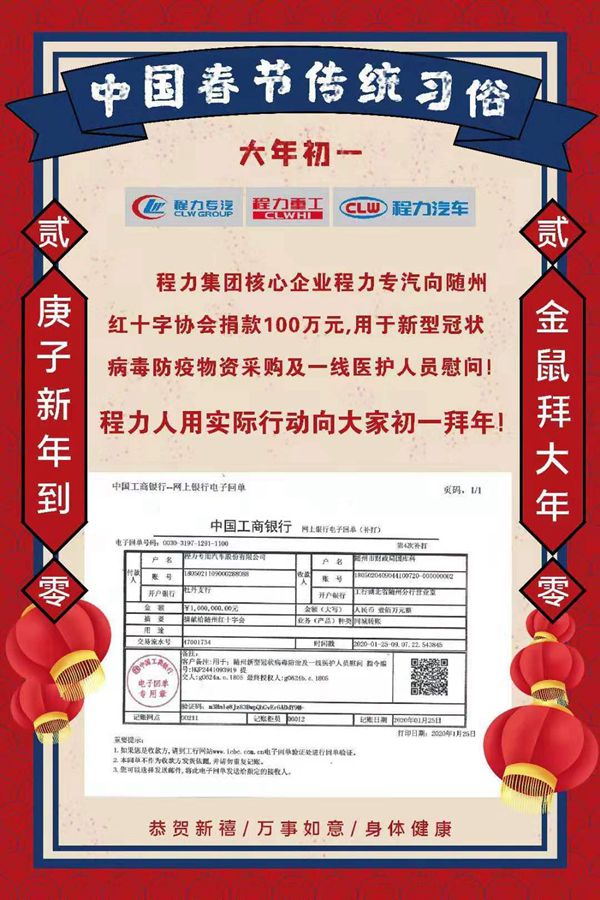 | 湖北程力集團(tuán)向隨州市紅十字會捐贈人民幣100萬元,用于抗擊新冠肺炎疫情。此外,該公司正在抓緊調(diào)配設(shè)備,趕制負(fù)壓救護(hù)車,助力早日打贏這場沒有硝煙的戰(zhàn)爭。 “各位程力家人,今年除夕我就不給大家發(fā)紅包了,我代表大家向隨州紅十字會捐獻(xiàn)100萬元!贝竽瓿跻,程力汽車集團(tuán)董事長程阿羅的一則微信刷爆隨州人的朋友圈,他說,這是所有程力人的心意,將專項用于隨州新型冠狀病毒感染肺炎防治物資保障和醫(yī)護(hù)人員慰問。 目前,運送新冠肺炎患者的負(fù)壓救護(hù)車緊缺。程力集團(tuán)是全國12家具有該車生產(chǎn)資質(zhì)的企業(yè)之一,也是湖北唯一一家。該公司正在緊急調(diào)配負(fù)壓設(shè)備,并同時召回員工100余人,加班加點生產(chǎn)趕制。預(yù)計2月3日和4日分別交付4臺,5日開始每天可交付7臺。 程阿羅表示,程力還將為曾都區(qū)捐獻(xiàn)一臺負(fù)壓救護(hù)車!俺塘瘓F(tuán)將堅決扛起社會責(zé)任,全力支持配合湖北省及隨州市防治工作,為疫情防治做出程力貢獻(xiàn)!”程阿羅說。 ![]() |