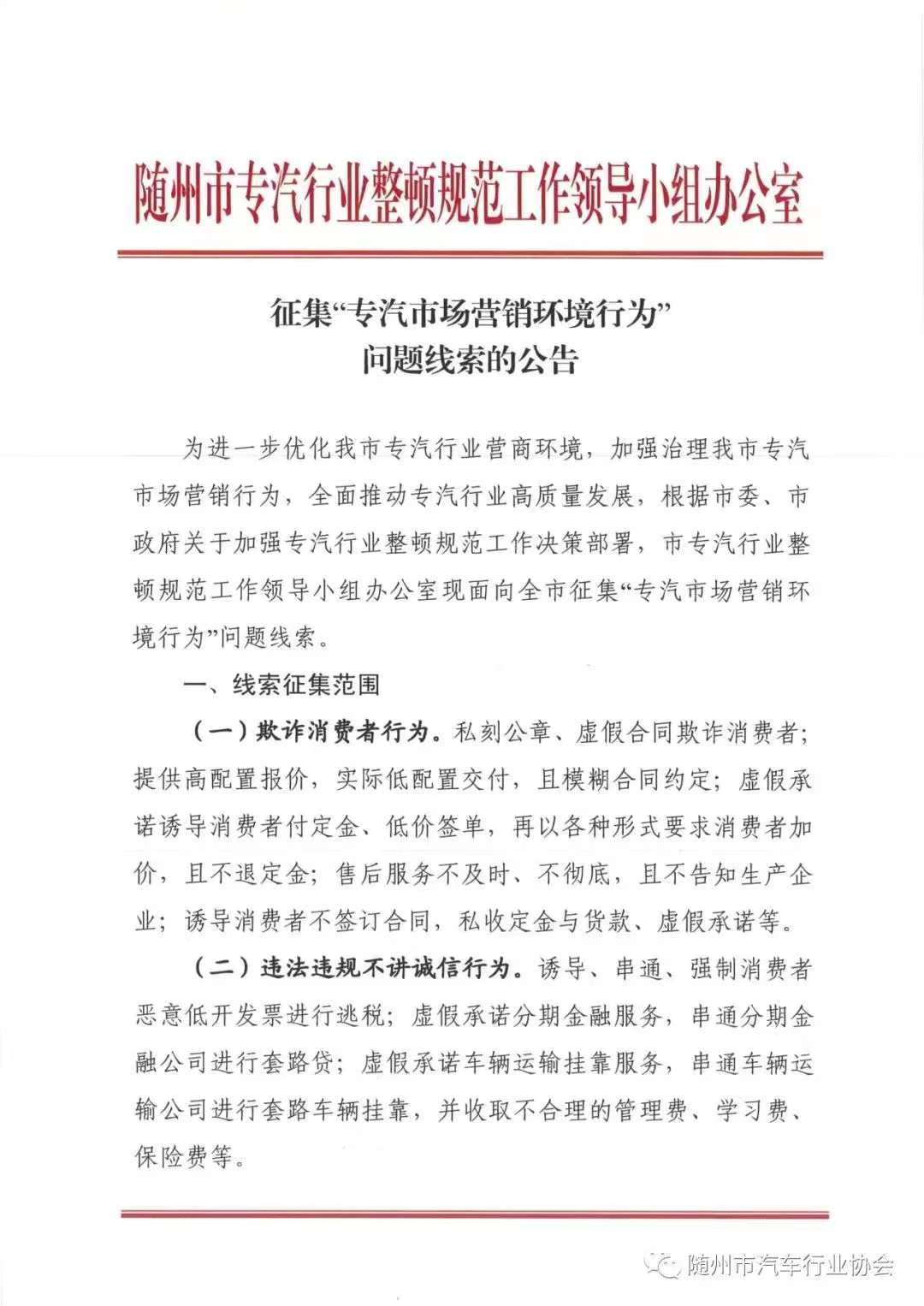 隨州市汽車行業(yè)協(xié)會(huì)關(guān)于整頓“隨州專汽市場(chǎng)營(yíng)銷環(huán)境行為”銷售欺詐投訴舉報(bào)公告