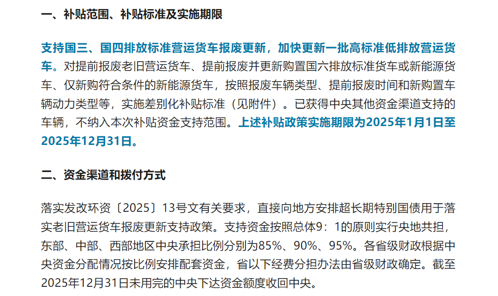 3月14日 深圳啟動以舊換新實施方案 深圳市發(fā)展和改革委員會、深圳市財政局關(guān)于印發(fā)2025年超長期特別國債資金加力擴圍支持消費品以舊換新實施方案的通知 ,明確指出,在2024年政策基礎(chǔ)上,將老舊營運貨車報廢更新補貼范圍擴大至國四排放標準營運貨車。對提前報廢國四及以下排放標準營運柴油貨車,平均每輛補貼3萬元;提前報廢并新購國六排放標準貨車或新能源貨車,平均每輛補貼8萬元;僅新購新能源城市冷鏈配送貨車,每輛補貼3.5萬元。