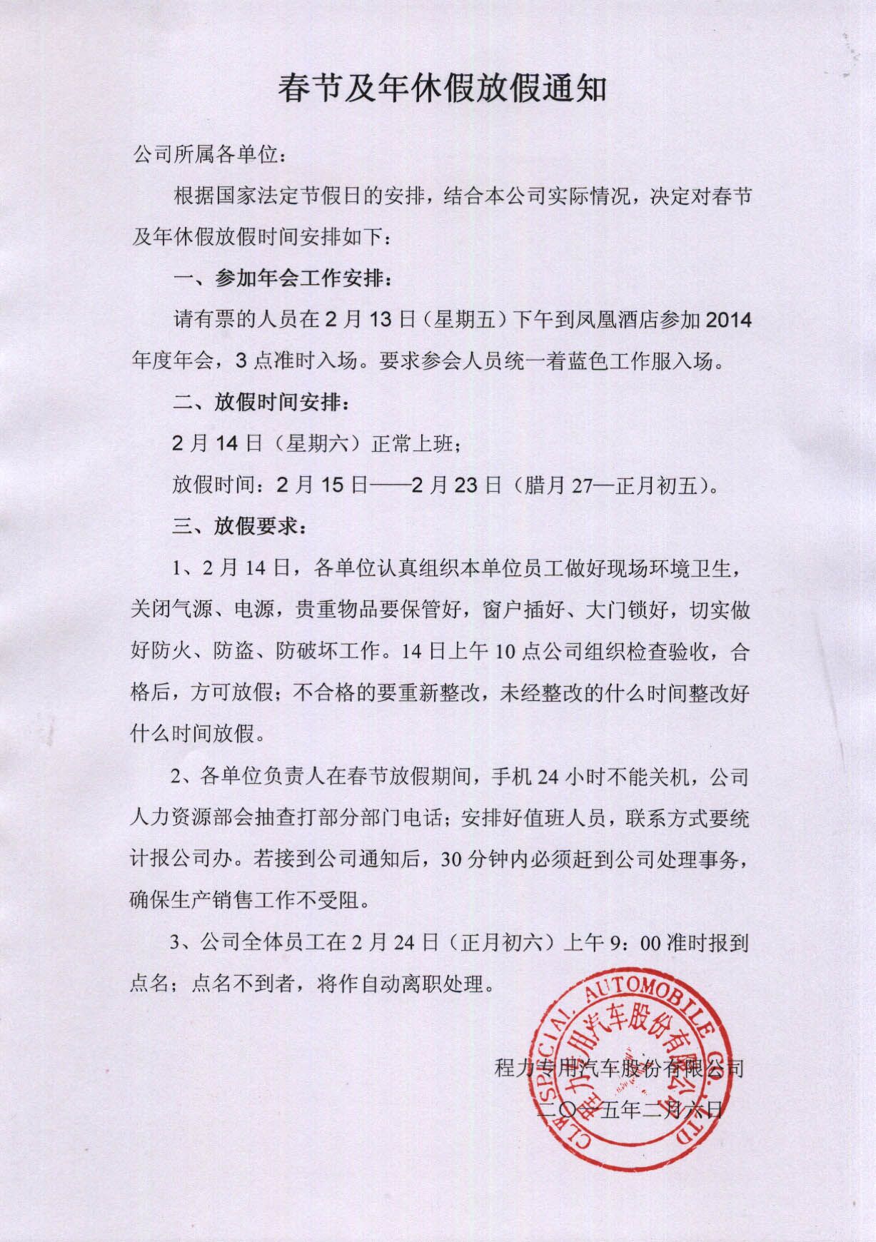 2015年湖北程力春節(jié)放假通知