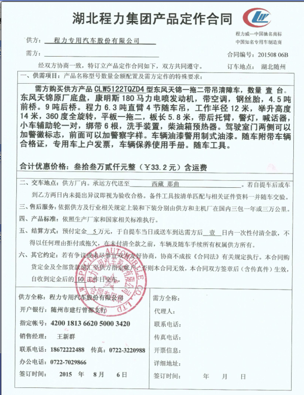 程力公司的產(chǎn)品從國內(nèi)遠(yuǎn)銷國外,經(jīng)營活動中交易形式多樣化。近日,有銷售人員來法律事務(wù)部進(jìn)行咨詢,張經(jīng)理現(xiàn)在有個老客戶要訂購一批車子,問在簽訂合同時,經(jīng)雙方協(xié)商一致,但沒有寫進(jìn)合同的部分,法律上是否有效?我們給張經(jīng)理解釋,口頭承諾沒寫成書面如果一方不認(rèn)可是無效的。我們建議張經(jīng)理,為避免今后糾紛,合同內(nèi)容要盡量詳細(xì),履行期限、貨款金額、付款方式等內(nèi)容要盡可能涉及到,若有其他特殊約定可以備在合同里或簽訂一份補(bǔ)充協(xié)議。下面是湖北程力汽車股份有限公司汽車銷售合同模板,簡稱(湖北程力、程力專汽)銷售合同模板。![]() 程力專用汽車股份有限公司銷售部 |