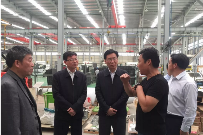 (圖一:各位領(lǐng)導(dǎo)來到宣傳車車間視察,左邊至右邊依次為萬副區(qū)長、曾區(qū)長、梁副主席、程力重工常務(wù)副總李會(huì)成、祁家灣街道張主任)