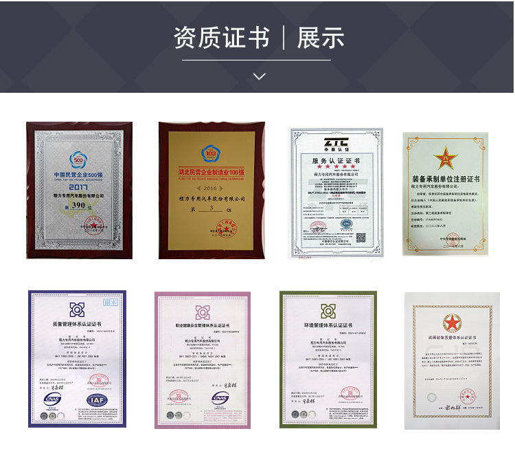 多樣│滿足各種專汽需求 專用車產(chǎn)業(yè)細分產(chǎn)品眾多,每個產(chǎn)品的市場格局由于行業(yè)門檻和市場特征的不同具有較大差異。隨著高等級公路的建設(shè)、物流市場的逐漸成熟,以及國內(nèi)大量基礎(chǔ)設(shè)施建設(shè),專用汽車產(chǎn)品結(jié)構(gòu)較過去有了很大變化,重型車和輕型車比例處于增長趨勢,中型車比例繼續(xù)下降;體現(xiàn)專用功能特性的產(chǎn)品比重加大;種數(shù)得到大幅增加,產(chǎn)品結(jié)構(gòu)更加合理。 程力主要產(chǎn)品包括灑水車、加油車、冷藏車、油罐車、垃圾車、吸污車、道路清掃車、高壓清洗車、高空作業(yè)車等八大系列100多個品種車型及其相關(guān)專用汽車配件,技術(shù)力量雄厚、檢測手段完備,擁有大型設(shè)備750臺(套)及16條總裝生產(chǎn)線。 產(chǎn)品質(zhì)量穩(wěn)定,經(jīng)營方式靈活,公司現(xiàn)已全面通過ISO9001-2008 國際質(zhì)量體系認證、3C國際強制產(chǎn)品認證,并通過出口產(chǎn)品的各項認證!俺塘ν碑a(chǎn)品有680多個品種上國家公告目錄,其中有不少的車型如灑水車、垃圾車、吸污車、吸糞車等環(huán)衛(wèi)系列車型享受國家免車輛購置稅優(yōu)惠條件。