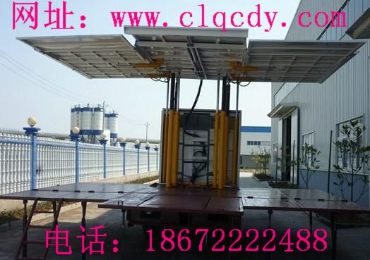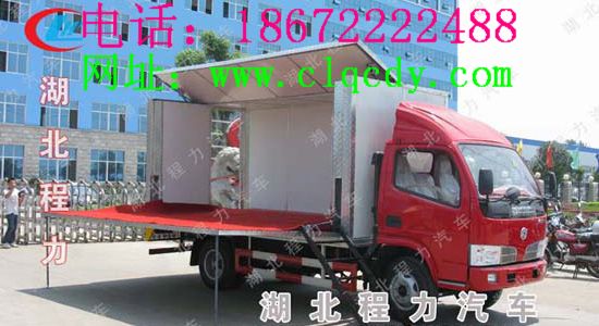 流動(dòng)舞臺車的結(jié)構(gòu)功能說明:流動(dòng)舞臺車:通過機(jī)械裝置展開、搭建成具有頂棚和舞臺版演出的舞臺,并配備安裝舞臺燈光、音響等所需的專門裝置及電源接口等廂式專用車輛。 舞臺頂棚 :舞臺上方用于懸掛燈具、布景,并能遮擋風(fēng)雨和陽光的結(jié)構(gòu)裝置。 頂廂板:車廂體的頂板,升起后作為舞臺頂棚的固定部分。 側(cè)廂板:廂體的側(cè)板,展開或升起后做為舞臺的組成部分。廂體的側(cè)板,展開或升起后做為舞臺的組成部分。 舞臺臺板:由支架和強(qiáng)化龍骨、竹夾地板構(gòu)成(耐磨降噪)適用于表演;安裝在整車車架或副車架上的支撐機(jī)構(gòu),演出時(shí)用于支撐舞臺車體,已形成一個(gè)無降沉、無晃動(dòng)、穩(wěn)定的基礎(chǔ)舞臺平面的裝置。 舞臺臺板滑道:配合活動(dòng)舞臺臺板展開、收攏的滑道。 舞臺臺板支撐桿:用于支撐活動(dòng)舞臺臺板的機(jī)械裝置,能夠調(diào)節(jié)寬度。 燈光桿:布置于頂棚上,用于懸掛燈具的專用結(jié)構(gòu) 景物桿:布置于頂棚上,用于懸掛演出用布景等專用結(jié)構(gòu)。 電控箱:用于放置演出所需的配電設(shè)備及調(diào)光設(shè)備的控制箱。 舞臺臺口:靠近觀眾側(cè),舞臺臺板上表面與頂棚下表面的矩形區(qū)域。 舞臺凈高:舞臺臺板上表面與頂棚最低點(diǎn)之間的距離。 升降導(dǎo)向架:一種與車架或副車架固定聯(lián)結(jié),在垂直升降過程中可防止頂棚傾斜,在行駛及演出是對整車及舞臺起到穩(wěn)定作用的框架結(jié)構(gòu)。 廂體整體采用沖壓件組合骨架,外板為鋁合金平板,內(nèi)飾為防水膠合板,舞臺板為專用舞臺防滑板。 右側(cè)外板及頂板右側(cè)通過液壓舉升至與臺面垂直位置,形成遮陽、擋雨、燈光固定的頂棚及廣告的承載面。 右側(cè)內(nèi)板(舞臺板)為兩折疊,通過液壓翻轉(zhuǎn)后作為舞臺,舞臺左右加裝延展板,前面加裝T型臺。