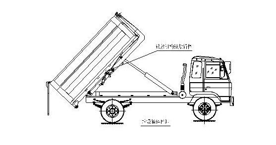 完成垃圾箱體的上車工作,松開取力器,整車可以運(yùn)輸行駛。 步驟5. 在卸垃圾前,整車運(yùn)轉(zhuǎn)達(dá)到6個(gè)標(biāo)準(zhǔn)氣壓時(shí)掛上取力器,打開垃圾箱后門鎖緊裝置,在前級(jí)二聯(lián)多路閥處,首先確定鎖緊架鎖緊垃圾箱體(拉起鎖緊鉤操作手柄至鎖緊位置),然后拉起拉臂操作手柄至伸出位置,垃圾箱體備傾斜舉起垃圾卸出;如圖: