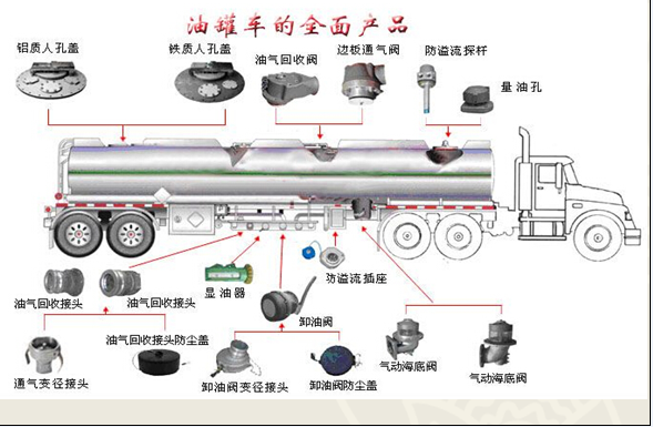 (1)海底閥:又稱(chēng)緊急切斷閥,安裝于罐體底部,進(jìn)行下裝加油時(shí)使用,在油罐發(fā)生意外時(shí),由于斷槽處于無(wú)法承載過(guò)大沖力,車(chē)體管路與罐體會(huì)自動(dòng)斷開(kāi),而自動(dòng)對(duì)中柱塞和耐用彈簧會(huì)依舊保持密封,罐內(nèi)介質(zhì)不會(huì)泄漏,從而保證油罐安全。 (2)油氣回系統(tǒng):①油氣回收閥:是將在裝卸油料時(shí)所產(chǎn)生的油氣回收的一種裝置,可以直接安裝在油罐車(chē)頂部罐體上,避免了油氣外泄。 ②油氣回收接頭:罐車(chē)油氣回收系統(tǒng)組成一個(gè)封閉的循環(huán)系統(tǒng),有效的將在油站加油過(guò)程中產(chǎn)生的油氣回收再利用,避免了油氣擴(kuò)散