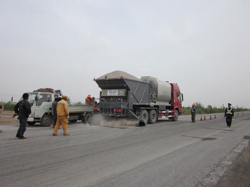二、同步碎石封層車系統(tǒng)配置 同步碎石車主要有瀝青灑布系統(tǒng)、石料撒布系統(tǒng)、電氣操作系統(tǒng)、輔機(jī)系統(tǒng)組成。 瀝青灑布系統(tǒng) 噴灑系統(tǒng)主要有瀝青罐體、加熱部分、液壓部分、控制部分和噴灑部分組成。 1、瀝青罐 罐體外壁采用不銹鋼磨砂板,中間加保溫填料,內(nèi)部由加熱鍋爐和導(dǎo)熱油盤管組成,外觀整潔大方。罐體外部增設(shè)的氣控閥組,實(shí)現(xiàn)了瀝青在管路中的大小循環(huán),避免了瀝青局部過(guò)熱、老化。 2、加熱部分 加熱裝置選用進(jìn)口燃燒器和配套的高效鍋爐,它具有燃燒效率高,霧化效果好,耗油量少,加熱速度快,運(yùn)行安全、穩(wěn)定等。不需要人工的監(jiān)護(hù),保證管路中的瀝青都能獲得有效的加熱溫度。 3、液壓部分 采用國(guó)際知名品牌的元件(液壓泵、液壓馬達(dá)),保證傳動(dòng)性能的可靠。 4、控制部分 采用編碼器分別準(zhǔn)確檢測(cè)車速、瀝青泵轉(zhuǎn)速,確保灑布精度,其中雷達(dá)、編碼器以及主電路開關(guān)元件均是進(jìn)口元件。設(shè)定灑布量后,PLC自動(dòng)計(jì)算出車速和泵速,實(shí)現(xiàn)了灑布的自動(dòng)控制,并可以為司機(jī)推薦合理車速。 5、噴灑部分 每個(gè)噴嘴的啟閉都有氣閥單獨(dú)控制來(lái)實(shí)現(xiàn),通過(guò)特殊的管道設(shè)計(jì),保證壓力均勻及良好的噴灑效果。 石料撒布系統(tǒng) 石料撒布系統(tǒng)有料倉(cāng)、料門控制機(jī)構(gòu)和撒布器組成。 料倉(cāng)內(nèi)安裝有內(nèi)影藏式中置頂翻轉(zhuǎn)軸采用通軸保證料倉(cāng)升起的平穩(wěn)性;料門為16路控制,采用了角度螺旋角度控制儀,要使料門達(dá)到某個(gè)開度,可在角度控制儀上設(shè)置料門打開角度,非常方便,準(zhǔn)確。有效調(diào)整撒布均勻度,改變了傳統(tǒng)石料撒布不均的情況;分料板和下料板的調(diào)節(jié)范圍大,適用不同規(guī)格(S3~S24mm)的石料。 電氣操作系統(tǒng) 1、根據(jù)不同的工作需求給操作人員提供準(zhǔn)確的灑布參數(shù)。 通過(guò)后操作臺(tái)上顯示屏參數(shù)的設(shè)定,實(shí)際測(cè)量參數(shù)不斷的改變能準(zhǔn)確的反應(yīng)出設(shè)備的運(yùn)行情況。 2、手動(dòng)操作簡(jiǎn)單,能實(shí)現(xiàn)手動(dòng)/自動(dòng)的切換,提高了工作效率。 3、能根據(jù)路面的寬度隨意調(diào)整噴灑瀝青、撒布石料的寬度。 4、采用限位開關(guān)裝置,對(duì)噴頭架、料倉(cāng)升降的進(jìn)行控制,避免超程使人機(jī)受到傷害。 5、配置導(dǎo)熱油自動(dòng)報(bào)警裝置,具有料位上限、下限報(bào)警,瀝青下限報(bào)警指示功能。 三、 設(shè)備優(yōu)點(diǎn) ◆ 獨(dú)家采用全液壓驅(qū)動(dòng)模式,不需要添加任何輔助動(dòng)力使操作更加簡(jiǎn)單方便。 ◆ 獨(dú)家采用高效的導(dǎo)熱油鍋爐升溫,使溫升速度大大的得到提升,打破了傳統(tǒng)的煙道加溫方式。 ◆ 該設(shè)備采用內(nèi)舉升料斗就可實(shí)現(xiàn)石屑撒布施工,更方便涵洞施工、橋下施工、以及彎道施工; ◆ 該設(shè)備完全采用電氣控制,自動(dòng)化程度高,,能精確的計(jì)算出設(shè)備在施工過(guò)程中瀝青噴灑量和石屑撒布量的多少; ◆ 料門控制采用角度儀,保證設(shè)備下料的精度; ◆ 降低了施工的勞動(dòng)強(qiáng)度,節(jié)約了人力資源,降低施工成本,提高工作效率、工作質(zhì)量; ◆ 整機(jī)運(yùn)行穩(wěn)定,撒布均勻,可自由調(diào)節(jié)灑瀝青撒料寬度; ◆ 良好的保溫層確保保溫性能指數(shù)≤20℃/8h,且防腐耐用; ◆ 可以噴灑各種瀝青介質(zhì),撒布從S3~S24mm的石料; ◆ 設(shè)備采用加工精確度高的噴嘴,使每個(gè)噴嘴噴灑一致性和噴灑效果得到充分保證; ◆ 整體操作更具人性化,具有遠(yuǎn)程控制,也有現(xiàn)場(chǎng)操作,給操作者帶來(lái)了很大的便利; ◆ 通過(guò)電氣控制與液壓系統(tǒng)恒壓裝置的完美結(jié)合,實(shí)現(xiàn)了零起步噴灑; ◆ 整機(jī)經(jīng)過(guò)多次的工程施工改進(jìn),工作性能可靠,操作維護(hù)方便,性價(jià)比高。 四、注意事項(xiàng) 1、 灑布車在一次作業(yè)完畢或轉(zhuǎn)換施工場(chǎng)地時(shí),必須對(duì)瀝青泵和管路進(jìn)行清洗,否則下次無(wú)法工作。 2、 灑布車在噴灑前,一定要檢查各閥門位置是否正確。 3、 加入瀝青罐內(nèi)的熱態(tài)瀝青必須達(dá)到160~180℃的工作溫度,長(zhǎng)距離運(yùn)輸或工作時(shí)間過(guò)長(zhǎng),可使用加溫裝置保溫,但不能當(dāng)作熔油爐。 4、 瀝青罐不能灌的太滿,加油口蓋必須關(guān)緊,運(yùn)輸過(guò)程中以防瀝青溢出。 5、 用燃燒器對(duì)罐內(nèi)瀝青加溫時(shí),瀝青高度必須超過(guò)燃燒室上平面,否則燃燒室將被燒壞。 6、 假如瀝青泵和管道被凝固的瀝青堵塞,不可以強(qiáng)行轉(zhuǎn)動(dòng)泵,可使用噴燈烘烤,應(yīng)避免直接烘烤球閥和橡膠件。 7、 剛開始噴灑瀝青時(shí),起步須緩慢,汽車保持低速行駛。不得猛踩油門,以防離合器、瀝青泵等部件損壞。 8、 本車有前后兩個(gè)控制臺(tái),當(dāng)使用前控制臺(tái)時(shí),需將開關(guān)撥到前控制,此時(shí)后控制臺(tái)只能控制噴管的升降。當(dāng)使用后控制臺(tái)時(shí),需將開關(guān)撥到后控制,此時(shí)前控制臺(t